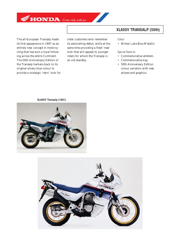 Nel panorama delle Transalp di tutte le epoche, un posto particolare è occupato dalla Honda Transalp 600 del 1999 nella Versione “Anniversary“, anche detta l'”Unicorno“. Le sue particolarità sono dovute a diversi fattori: in primis un limitato numero di esemplari, una livrea che ricorda le colorazioni dei primissimi Transalp, gli  scudetti sulle carene, i cerchi dorati ed infine le chiavi personalizzate.